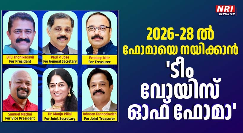 ഫോമായുടെ 2026-2028 കാലയളവിലേക്കുള്ള ഭാരവാഹികളുടെ തിരഞ്ഞെടുപ്പ് 2026 ജൂലൈ 30 മുതൽ ഓഗസ്റ്റ് 2 വരെ ഹ്യൂസ്റ്റണിൽ വച്ചു നടക്കുന്ന ഫാമിലി കൺവെൻഷനോടനുബന്ധിച്ചു നടക്കും. തങ്ങളുടെ മുന്നോട്ടുള്ള പ്രയാണത്തിന് ഫോമായെ സ്നേഹിക്കുന്ന എല്ലാവരുടേയും അകമഴിഞ്ഞ പിന്തുണ ഇവർ അഭ്യർത്ഥിച്ചു.