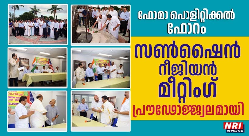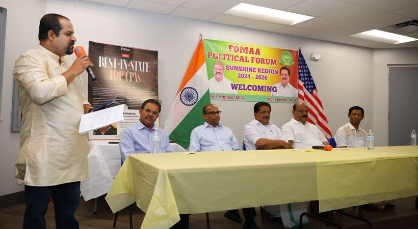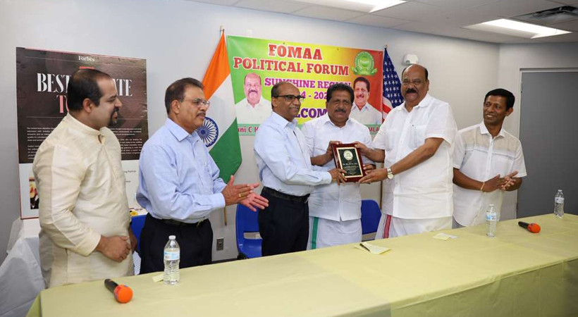 മയാമി : ഫോമാ പൊളിറ്റിക്കൽ ഫോറം ഡേവി ഗാന്ധി സ്ക്വയർ ഹാളിൽ നടത്തിയ മീറ്റിങ്ങിൽ മുൻ പൊതുമരാമത്തു വകുപ്പ് മന്ത്രി മോൻസ് ജോസഫ് എം എൽ എ, മാണി സി കാപ്പൻ എം എൽ എ എന്നിവർ മുഖ്യാതിഥികളായി.