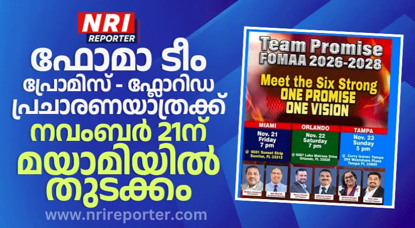 വിശ്വസ്തത, സത്യസന്ധത, പ്രതിബദ്ധത, സുതാര്യത എന്നിവ മുഖമുദ്രയാക്കി സംഘടനയുടെ യശസ്സ് കാത്തുസൂക്ഷിച്ചു പ്രവർത്തിക്കുമെന്ന പ്രഖ്യാപനവുമായി ഫോമാ തെരെഞ്ഞെടുപ്പിൽ മത്സരിക്കുന്ന മാത്യു വർഗീസ് നേതൃത്വം നൽകുന്ന ടീം പ്രോമിസിന്റ ഫ്ലോറിഡ പ്രചാരണയാത്രക്ക് നവംബർ 21 വെള്ളിയാഴ്ച്ച മയാമിയിൽ തുടക്കമാകും. ടീം പ്രോമിസ് സ്ഥാനാർത്ഥികളായി മാത്യു വർഗീസ് – പ്രസിഡന്റ് , അനു സ്കറിയ -സെക്രട്ടറി, ബിനോയ് തോമസ് – ട്രഷറർ , ജോൺസൺ ജോസഫ് – വൈസ് പ്രസിഡന്റ് , രേഷ്മ രഞ്ജൻ – ജോയിൻറ് സെക്രട്ടറി, ടിറ്റോ ജോൺ – ജോയിന്റ് ട്രഷറർ എന്നിവരാണ് മത്സരിക്കുന്നത്.