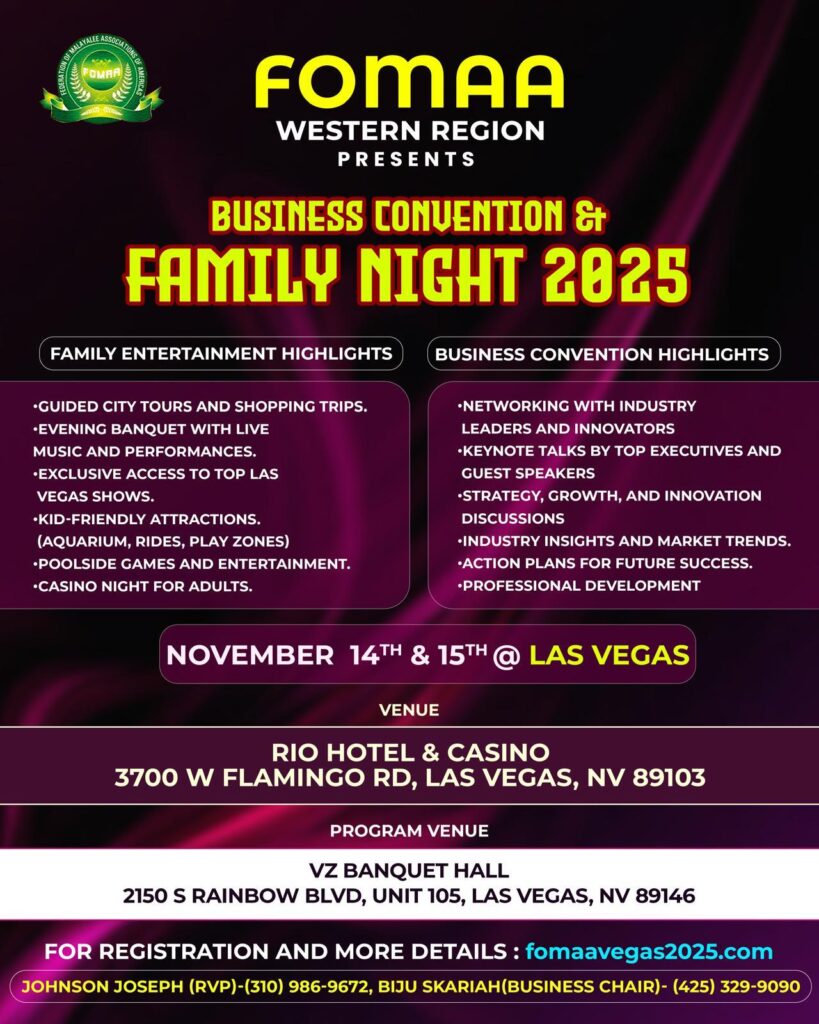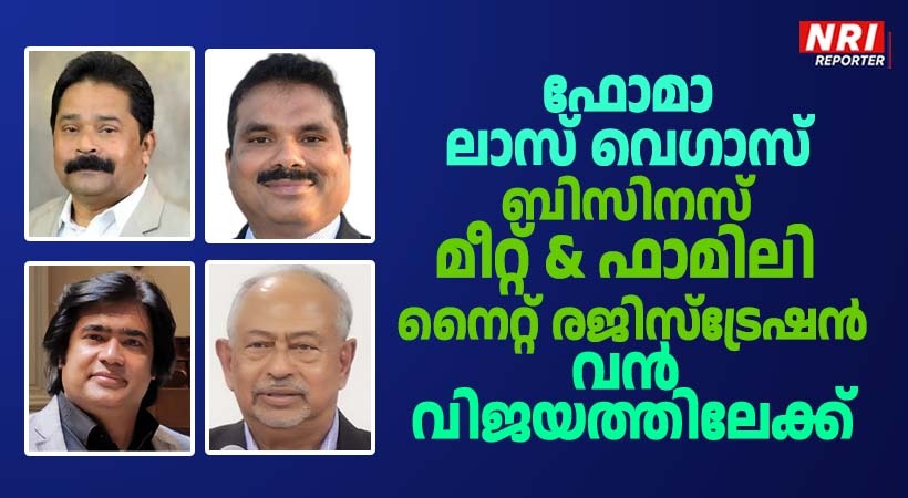 ലാസ് വേഗസ്: ഫോമാ വെസ്റ്റേൺ റീജിയന്റെ ആഭിമുഖ്യത്തിൽ ആദ്യമായി നടത്തപ്പെടുന്ന ബിസിനസ് മീറ്റും ഫാമിലി നൈറ്റും നവംബർ മാസം പതിനാലാം തീയതി വെള്ളിയാഴ്ച മുതൽ ആരംഭിക്കും. പരിപാടിയിലേക്കുള്ള ഓൺലൈൻ രജിസ്ട്രേഷനുകൾക്ക് തിരക്കേറിയത് കാരണം ഹോട്ടൽ കോൺട്രാക്ടിൽ കൂടുതൽ മുറികൾ കൂട്ടിച്ചേർക്കേണ്ടതായി വന്നു.