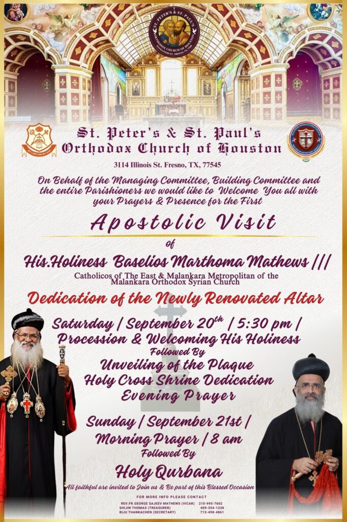 സെപ്റ്റംബർ 20, 21 തീയതികളിൽ അമേരിക്കയിലെ സൗത്ത് വെസ്റ്റ് ഭദ്രാസനത്തിൽ കീഴിലുള്ള ഹൂസ്റ്റൺ സെന്റ് പീറ്റേഴ്സ് ആൻഡ് സെന്റ് പോൾസ് (St. Peters and St,Pauls) ഇടവകയുടെ വി. മദ്ബഹായുടെ പുനഃ പ്രതിഷ്ഠയും കൽക്കുരിശ് കൂദാശയും കാതോലിക്ക ബാവ പൂർത്തീകരിക്കും. അന്നേ ദിവസങ്ങളിൽ നടക്കുന്ന വിവിധ പരിപാടികളിൽ ഭദ്രാസന മെത്രാപോലിത്ത അഭി. ഡോ. തോമസ് മാർ ഈ വാനിയോസ്, കോർ എപ്പിസ്കൊപ്പാമാർ, വന്ദ്യ വൈദികർ എന്നിവർ സഹകാർമ്മികരായിരിക്കും.