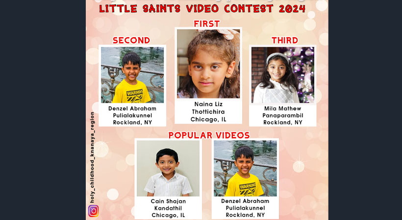 ചിക്കാഗോ: വടക്കേ അമേരിക്കയിലെ ക്നാനായ കാത്തലിക് റീജിയണിലെ ഹോളി ചൈൽഡ്ഹുഡ് മിനിസ്റ്റി (തിരുബാല സഖ്യം) യുടെ ആഭിമുഖ്യത്തിൽ നടത്തിയ ലിറ്റൽ സെയിന്റ്സ് വീഡിയോ മത്സരത്തിന്റെ വിജയികളെ പ്രഖ്യാപിച്ചു.