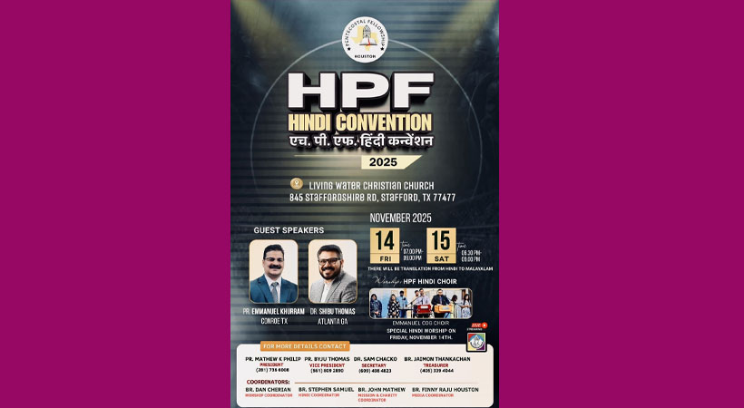 ഹ്യൂസ്റ്റൺ: ഹ്യൂസ്റ്റൺ പെന്തക്കോസ്തൽ ഫെലോഷിപ്പ് (HPF) സംഘടിപ്പിക്കുന്ന വാർഷിക ഹിന്ദി കൺവെൻഷൻ നവംബർ 14–15 തീയതികളിൽ സ്റ്റാഫോർഡിലെ Living Waters Christian Church ൽ (വിലാസം: 845 Staffordshire Rd, Stafford, TX 77477) നടക്കും. പാസ്റ്റർ ഇമ്മാനുവൽ ഖുറാം (Conroe)യും ഡോ. ഷിബു തോമസ് (Atlanta)യും ദൈവവചന ശുശ്രൂഷകൾ നയിക്കും.