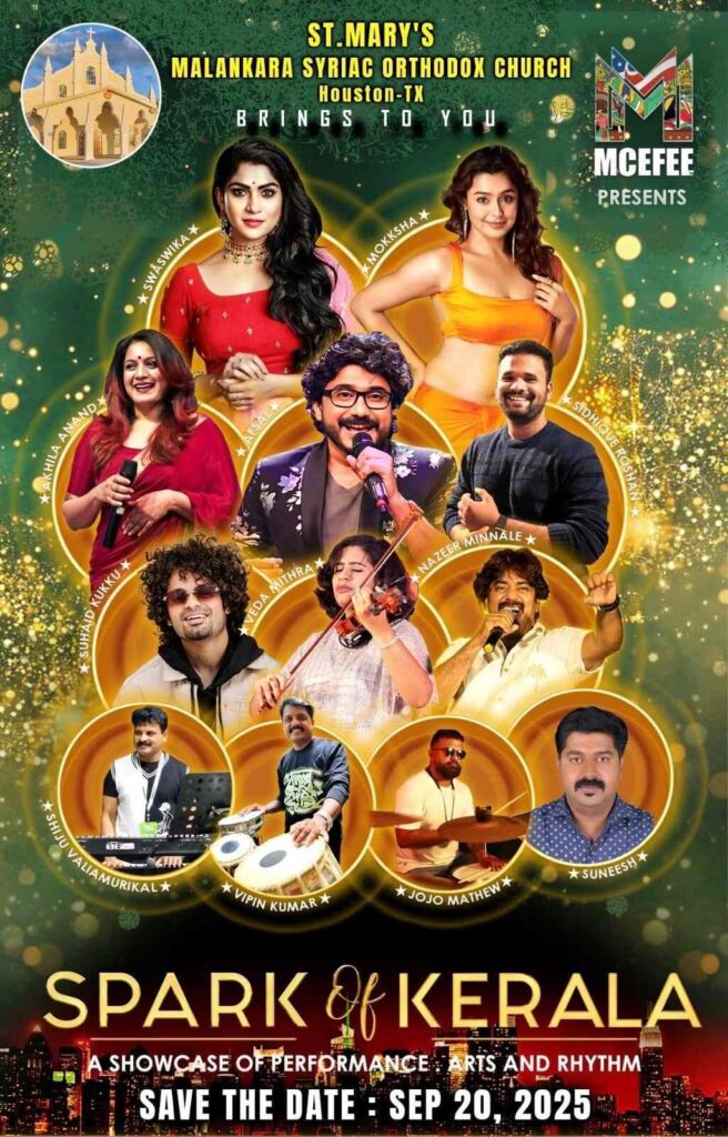ഹൂസ്റ്റൺ: മലയാളി കൾച്ചറൽ എക്സ്ചേഞ്ച് ഫൗണ്ടേഷൻ അണിയിച്ചൊരുക്കുന്ന സ്പാർക്ക് ഓഫ് കേരള ഉൽസവ തിമിർപ്പോടെ ഹൂസ്റ്റണിലേക്ക്. ചാരിറ്റി കർമ്മ പദ്ധതിയുമായി സെൻറ് മേരീസ് മലങ്കര യാക്കോബായ സിറിയൻ ഓർത്തഡോക്സ് ദേവാലയത്തിൻ്റ് ആഭിമുഖ്യത്തിലാണ് ഈ മാസം 20 ശനിയാഴ്ച്ച വൈകുന്നേരം സ്റ്റാഫോർഡ് ഇമ്മാനുവേൽ സെൻറർ ആഡിറ്റോറിയത്തിൽ അരങ്ങേറുന്നത്. ഇതോടെ ഹൂസ്റ്റൺ മലയാളികളുടെ ഓണാഘോഷ സമാപനം കളർ ഫുൾ ആകും.
