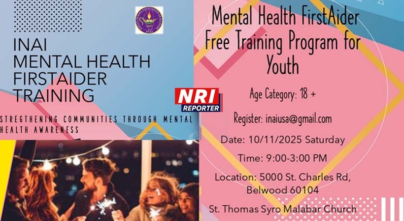 ഷിക്കാഗോ: ഇന്ത്യൻ നഴ്സസ് അസോസിയേഷൻ ഓഫ് ഇല്ലിനോയ് (INAI) കെന്നത്ത് യംഗ് സെൻ്ററുമായി ചേർന്ന് യുവാക്കൾക്കായി സൗജന്യ ഏകദിന യൂത്ത് മെന്റൽ ഹെൽത്ത് ഫസ്റ്റ് എയ്ഡർ പരിശീലനം നൽകുന്നു. 12 -ാം ക്ലാസിലോ അതിനു മുകളിലോ ഉള്ള വിദ്യാർത്ഥികൾക്ക് പങ്കെടുക്കാം.