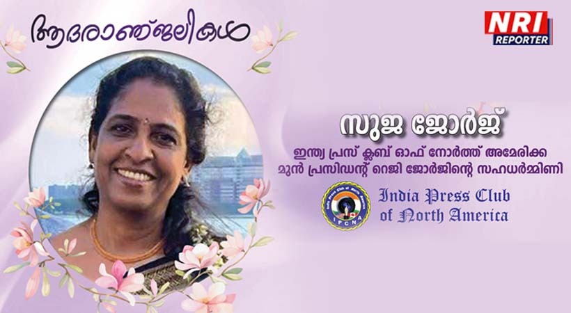 ന്യൂയോർക്ക് : ഇന്ത്യ പ്രസ് ക്ലബ് ഓഫ് നോർത്ത് അമേരിക്കയുടെ മുൻ പ്രസിഡന്റ്റും പ്രഥമ സെക്രട്ടറിയും ആയിരുന്ന റെജി ജോർജിന്റെ പത്നി സുജ ജോർജിന്റെ (58) വേർപാടിൽ ഐ.പി.സി.എൻ.എ അഗാധമായ ദുഃഖം അറിയിച്ചു. മെറിക്ക് ഫാർമസ്യുട്ടിക്കൽസിൽ അസോസിയേറ്റ് ഡയറക്റ്റർ ആയിരുന്ന സുജ ജോർജിന്റെ അപ്രതീക്ഷിതമായ അന്ത്യം സംഘടനയിലെ സഹപ്രവർത്തകരെ ഏറെ ദുഃഖിപ്പിക്കുന്നതാണെന്നും റെജി ജോർജും മക്കളായ രോഹിത് ജോർജ്, റോഷ്നി ജോർജ് എന്നിവരും ബന്ധുക്കളും കടന്നു പോകുന്ന മഹാവ്യസനത്തിൽ ഐ.പി.സി.എൻ.എ യും പങ്കു ചേരുന്നുവെന്നും അറിയിച്ചു.