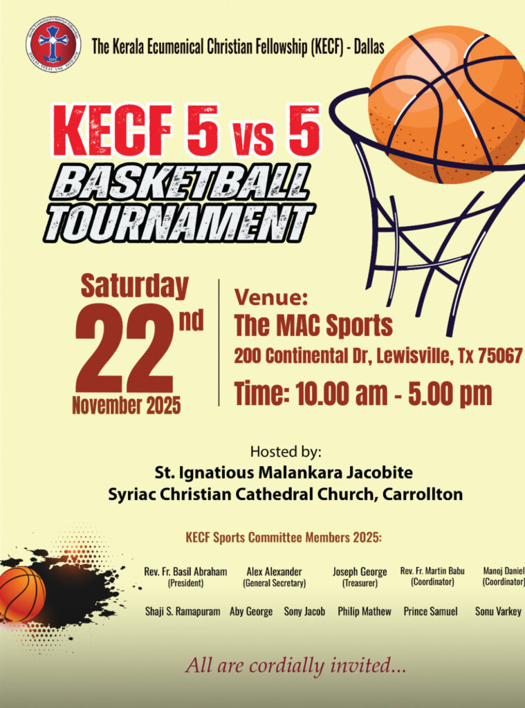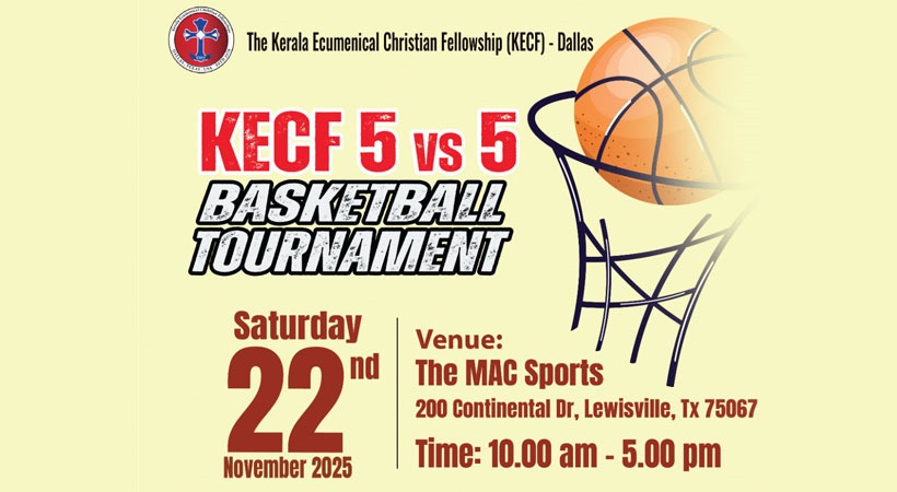 ഡാളസ്: കേരള എക്യുമെനിക്കൽ ക്രിസ്ത്യൻ ഫെലോഷിപ്പ് (KECF) – ഡാളസ് സംഘടിപ്പിക്കുന്ന അഞ്ചാമത് 5 vs 5 ബാസ്കറ്റ്ബോൾ ടൂർണമെന്റ് 2025 നവംബർ 22 (ശനി) ന് നടക്കും. ലൂയിസ്വില്ലിലുള്ള (Lewisville, TX) ദി മാക് സ്പോർട്സ് (The MAC Sports), 200 Continental Dr ആണ് ടൂർണമെന്റിന്റെ വേദി. അന്നേ ദിവസം രാവിലെ 10.00 മണിക്ക് മത്സരങ്ങൾ ആരംഭിക്കും. വൈകുന്നേരം 5.00 മണിക്ക് മത്സരങ്ങൾ സമാപിക്കും.