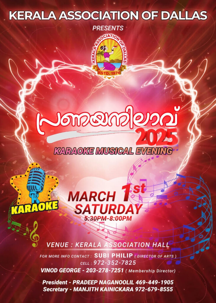 മാർച്ച് 1, 2024, ശനിയാഴ്ച വൈകുന്നേരം 5:30 മുതൽ രാത്രി 8:00 വരെ ഗാർലൻഡിലെ കെഎഡി/ഐസിഇസി ഹാളിൽ പ്രസിഡന്റ് പ്രദീപ് നാഗനൂലിന്റെ അധ്യക്ഷതയിൽ നടക്കുന്ന മനോഹരമായ പ്രണയ നിലാവ്! ശ്രുതിമധുരമായ ഈണങ്ങൾ, ഊർജ്ജസ്വലമായ പ്രകടനങ്ങൾ, സഹ സംഗീത പ്രേമികളുടെ കൂട്ടായ്മയിൽ നിങ്ങളുടെ ആലാപന കഴിവുകൾ പ്രകടിപ്പിക്കാനുള്ള അവസരം എന്നിവയാൽ നിറഞ്ഞ മനോഹരമായഒരു രാത്രിയിയിലേക് ഏവരെയും സ്വാഗതം ചെയ്യുന്നതായി സംഘാടകർ അറിയിച്ചു .