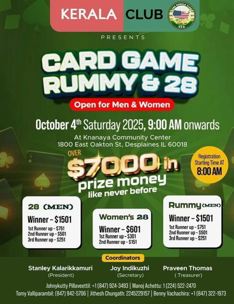 രാവിലെ എട്ട് മണിക്ക് രജിസ്ട്രേഷൻ ആരംഭിക്കും. പുരുഷൻമാർക്കും വനിതകൾക്കും 28 (ലേലം) , റമ്മി (പുരുഷൻമാർക്കും വനിതകൾക്കും) പുറമെ വനിതകൾക്കു മാത്രമായി 28 (ലേലം ) മത്സരങ്ങളും നടത്തപ്പെടും. 28 (ലേലം )ഓപ്പൺ വിഭാഗത്തിൽ 3 അംഗ ടീമിന്റെ രജിസ്ട്രേഷൻ ഫീ 150 ഡോളറും , റമ്മി വിഭാഗത്തിൽ ഇന്റിവിജ്വൽ രജിസ്ട്രേഷൻ ഫീ 100 ഡോളറും , വനിതാ വിഭാഗത്തിൽ 3 അംഗ ടീമിന്റെ രജിസ്ട്രേഷൻ ഫീ 75 ഡോളറുമാണ്.