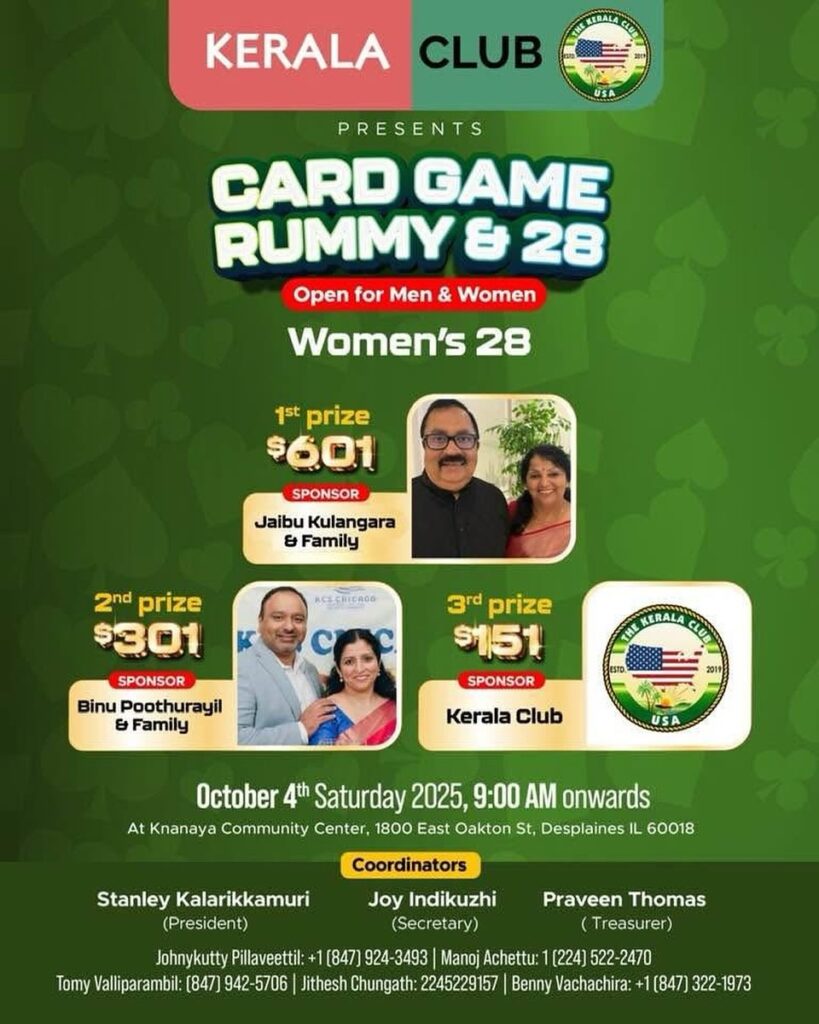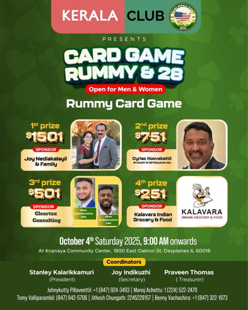 ജോണിക്കുട്ടി പിള്ളവീട്ടിൽ , മനോജ് അച്ചേട് , ജിതേഷ് ചുങ്കത്ത് , ടോമി വള്ളിപ്പറമ്പിൽ , ബെന്നി വാച്ചാച്ചിറ എന്നിവർ കോർഡിനേറ്റർസ് ആയ കമ്മിറ്റിയും കേരള ക്ലബ് പ്രസിഡന്റ് സ്റ്റാൻലി കളരിക്കേമുറിയുടെ നേതൃത്വത്തിലുള്ള ഭരണ സമിതിയും ഈ സീസണിലെ ആദ്യത്തെ കാർഡ് ഗെയിസ് അവസ്മരണീയമാക്കും .