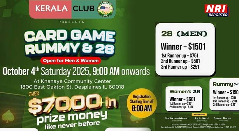 ഷിക്കാഗോ മലയാളികൾക്ക് ചീട്ടുകളിയുടെ പുതിയ ഒരു അനുഭവം കുറിക്കുവാനായി ഷിക്കാഗോ കേരള ക്ലബ് ഒക്ടോബർ നാലിന് (ശനി) ചീട്ടുകളി മത്സരം സംഘടിപ്പിക്കുന്നു. ഡെസ്പ്ലെയിൻസിൽ ഉള്ള ക്നാനായ കാത്തോലിക് സൊസൈറ്റി (K C S ) ഹാളിൽ മത്സരങ്ങൾ കൃത്യം 9 മണിക്ക് ചീട്ടുകളി ആരംഭിക്കും.