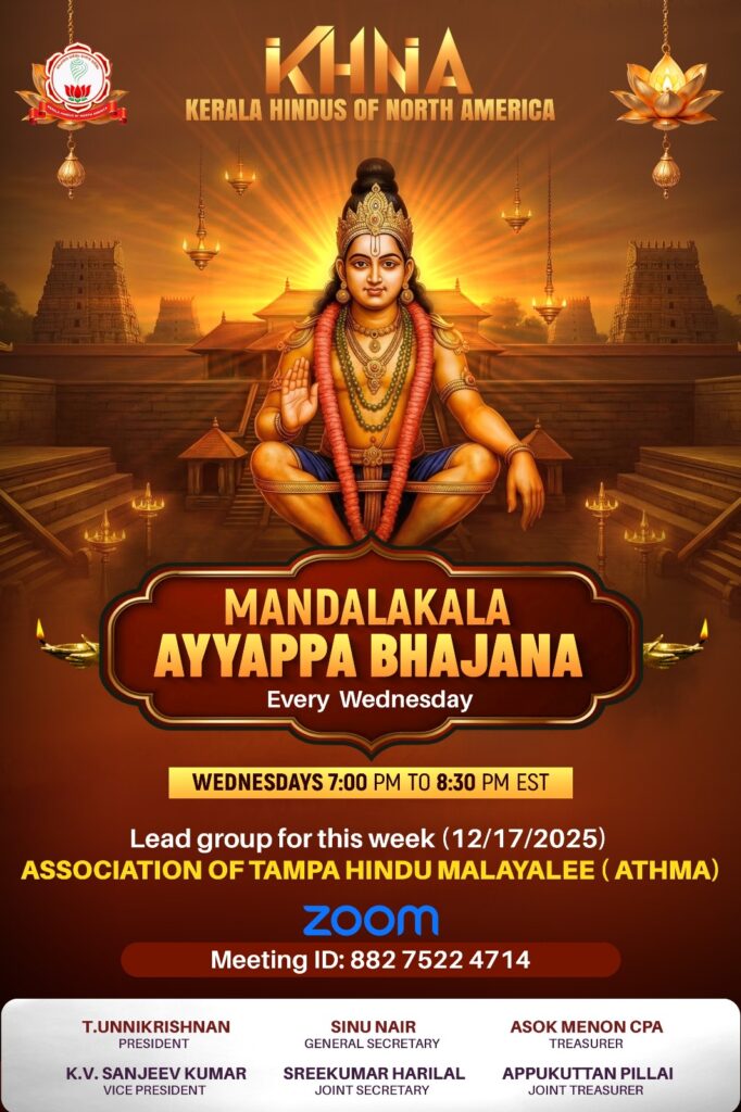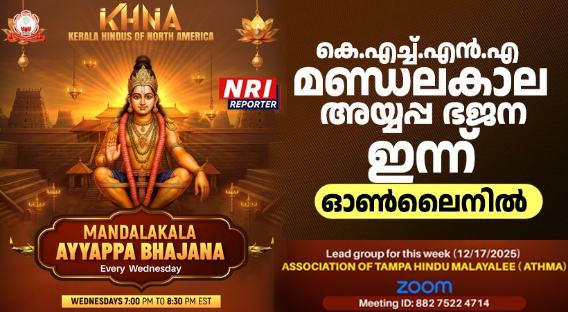 ടാംപ (ഫ്ലോറിഡ): മണ്ഡല-മകരവിളക്ക് തീർത്ഥാടന കാലത്തോടനുബന്ധിച്ച് വടക്കേ അമേരിക്കയിലെ അയ്യപ്പ ഭക്തർക്കായി കേരള ഹിന്ദുസ് ഓഫ് നോർത്ത് അമേരിക്ക (KHNA) എല്ലാ ബുധനാഴ്ചയും ഓൺലൈൻ ‘മണ്ഡലകാല അയ്യപ്പ ഭജന’ നടത്തുന്നു. കേരളത്തിന്റെ തനത് ആചാരങ്ങൾ അമേരിക്കയിൽ നിലനിർത്തുന്നതിന്റെ ഭാഗമായാണ് കെ.എച്ച്.എൻ.എ എല്ലാ ബുധനാഴ്ച്ചയും മകരവിളക്ക് വരെ ഭജന സംഘടിപ്പിക്കുന്നത്.