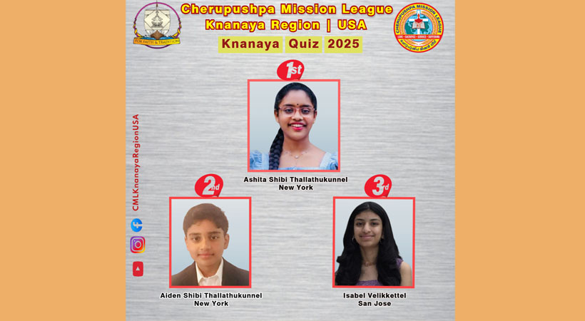ഷിക്കാഗോ: വടക്കേ അമേരിക്കയിലെ ക്നാനായ റീജിയൺ ദിനാചരണത്തോടനുബന്ധിച്ചു മതബോധന വിദ്യാർത്ഥികൾക്കായി നടത്തിയ ക്നാനായ ക്വിസ് മത്സര വിജയികളെ പ്രഖ്യാപിച്ചു.