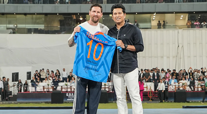 വാങ്കഡെ ക്രിക്കറ്റ് വേദിയിൽ മെസ്സി എത്തിയതിന് ഏകദേശം അരമണിക്കൂറിനുശേഷം ലൂയിസ് സുവാരസ്, റോഡ്രിഗോ ഡി പോൾ എന്നിവരുമായി മെസി സംവദിക്കുന്നതിനിടെയാണ് മാസ്റ്റർ ബ്ലാസ്റ്റർ തന്റെ സാന്നിധ്യം അറിയിച്ചത്. ഗ്രൗണ്ടില് ഇറങ്ങിയ സച്ചിൻ, മെസ്സിക്ക് ഇന്ത്യൻ ടീമിന്റെ ജഴ്സിയാണു സമ്മാനിച്ചത്. മെസ്സി അർജന്റീനയുടെ ലോകകപ്പ് ജഴ്സി സച്ചിനും നൽകി. ഇരവരും പത്താം നമ്പർ ജേഴ്സിയാണ് കരിയറിലെ അടയാളപ്പെടുത്തലുകളായി ഉപയോഗിച്ചിരുന്നത് എന്നതും ശ്രദ്ധേയം.