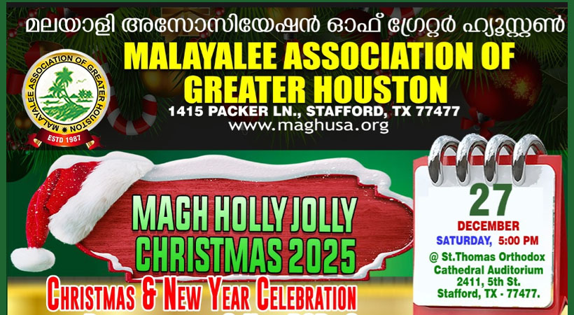 ഹൂസ്റ്റൺ: മലയാളി അസോസിയേഷൻ ഓഫ് ഗ്രേറ്റർ ഹൂസ്റ്റൺ ക്രിസ്മസ് ന്യൂ ഇയർ ആഘോഷവും 2026 ലേക്ക് ഉള്ള ഭരണസമിതിയുടെ സത്യപ്രതിജ്ഞ ചടങ്ങും ഡിസംബർ 27 ശനിയാഴ്ച വൈകുന്നേരം അഞ്ചുമണിക്ക് സ്റ്റാഫോർഡ് സെന്റ് തോമസ് ഓർത്തഡോക്സ് കത്തീഡ്രൽ ഹാളിൽ നടക്കും. തദവസരത്തിൽ മലയാളികളായ മേയർമാരും ജഡ്ജിമാരും വിവിധ മതസാമുദായിക സംഘടന പ്രമുഖരും പങ്കെടുക്കും. ക്രിസ്മസ് കരോൾഗാന മത്സരവും സംഘടിപ്പിക്കുന്നുണ്ട്. ഒന്നും രണ്ടും മൂന്നും സ്ഥാനം ലഭിക്കുന്നവർക്ക് ക്യാഷ് അവാർഡും ട്രോഫികളും സമ്മാനിക്കും. വിവിധ കലാവിരുന്നുകളും ഒരുക്കിയിട്ടുണ്ട്. പങ്കെടുക്കുന്ന എല്ലാവർക്കും രുചികരമായ ക്രിസ്മസ് ഡിന്നറും ഉണ്ടായിരിക്കും. വിവിധ കലാപരിപാടികളും അരങ്ങേറും.