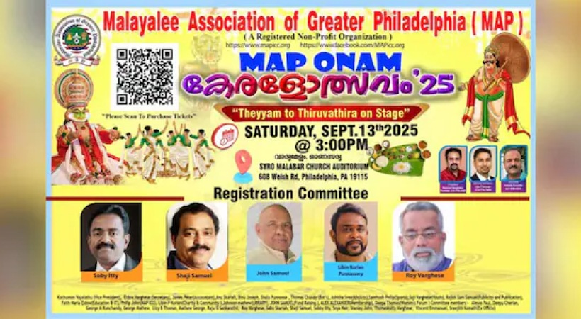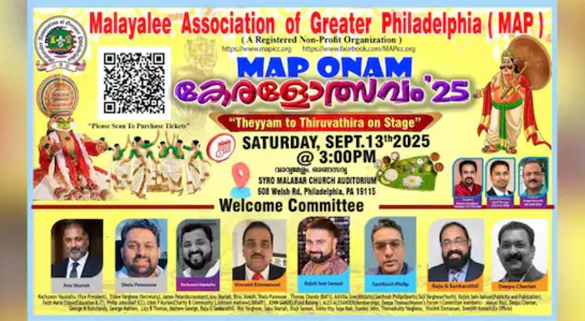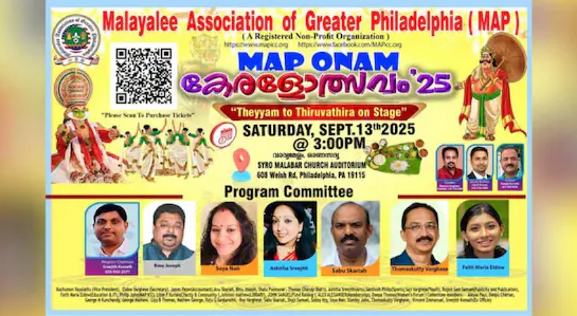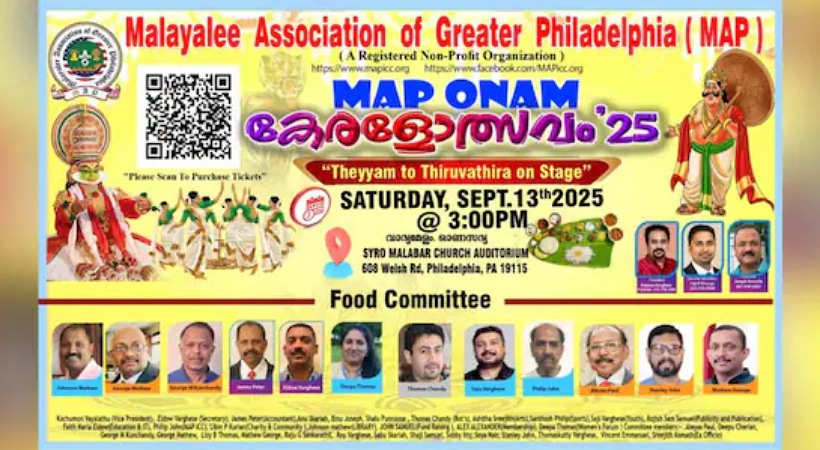 ഫിലഡൽഫിയ: മലയാളി അസോസിയേഷൻ ഓഫ് ഗ്രേറ്റർ ഫിലഡൽഫിയുടെ (മാപ്) ഓണാഘോഷത്തിൻ്റെ ഒരുക്കങ്ങൾ പൂർത്തിയായി. മലയാളി അസോസിയേഷൻ ഓഫ് ഗ്രേറ്റർ ഫിലഡൽഫിയുടെ നേതൃത്വത്തിൽ Map onam കേരളോത്സവം 25 ശനിയാഴ്ച ( സെപ്റ്റംബർ 13 ) ന് മൂന്ന് മണിക്ക് നടക്കും. വിവിധ ജില്ലകളിലെ കലാരൂപങ്ങൾ ഉൾപ്പെടുത്തിക്കൊണ്ടുള്ള കലാവിരുന്നാണ് ഇത്തവണത്തെ ഓണാഘോഷത്തിന്റെ പ്രധാന ആകർഷണം.