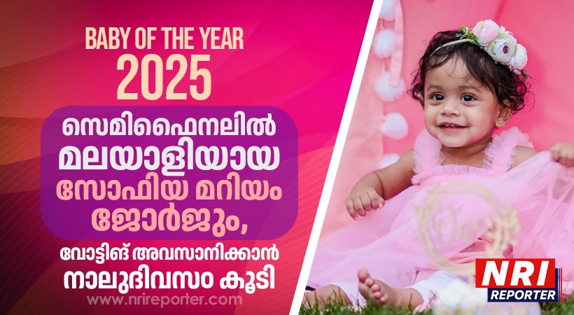 യുഎസില് രണ്ടു വയസുവരെ പ്രായമുള്ള കുട്ടികള്ക്കായി സംഘടിപ്പിക്കുന്ന ബേബി ഓഫ് ദി ഇയര് മത്സരത്തിന്റെ സെമിഫൈനലിൽ ഷിക്കാഗോയില് നിന്നുള്ള മലയാളിയായ സോഫിയ മറിയം ജോര്ജ്. അമ്പലത്തറ വീട്ടില് സല്ജോ ജോര്ജിന്റെയും വിന്സി ജോര്ജിന്റെയും രണ്ടാമത്തെ മകളാണ് സോഫിയ മറിയം ജോര്ജ്. മിയ ജോര്ജാണ് സഹോദരി.