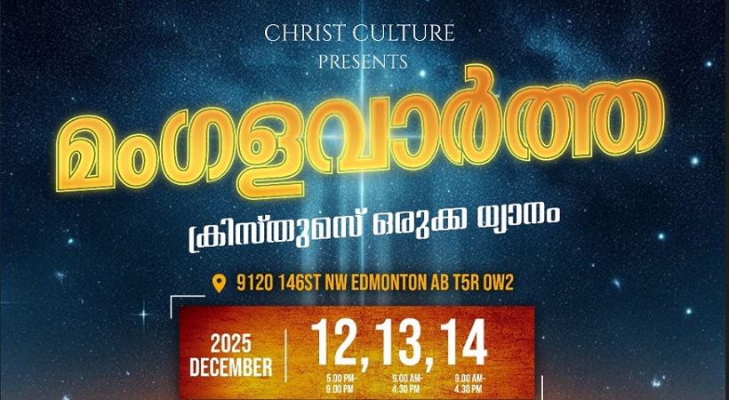 എഡ്മണ്ടൻ: അനുഗൃഹീത വചന പ്രഘോഷകനായ ബ്രദർ റെജി കൊട്ടാരത്തിന്റെ നേതൃത്വത്തില് ക്രൈസ്റ്റ് കള്ച്ചര് മിനിസ്ട്രി ടീം നയിക്കുന്ന ‘മംഗളവാർത്ത’ ധ്യാനം എഡ്മന്റൺ സെന്റ് അൽഫോൻസാ സീറോ മലബാർ കാത്തലിക് ഫൊറോനാ പള്ളിയിൽ.