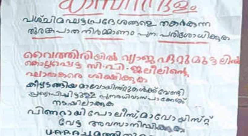 വയനാട് തുരങ്ക പാതയ്ക്കെതിരെ കോഴിക്കോട് പുല്ലൂരാംപാറയിൽ മാവോയിസ്റ്റ് പോസ്റ്ററുകൾ പ്രത്യക്ഷപ്പെട്ടത്. സംഭവത്തിൽ യുഎപിഎ ചുമത്തി പൊലീസ് കേസെടുത്തു. മാവോയോസ്റ്റ് കബനി ദളത്തിന്റെ പേരിൽ ആണ് പോസ്റ്റർ. പശ്ചിമഘട്ട പ്രദേശങ്ങളെ തകർക്കുന്ന തുരങ്കപാത നിർമാണം പുനഃപരിശോധിക്കണമെന്നാവശ്യപ്പെട്ടാണ് പോസ്റ്റർ. കൂടാതെ, പിണറായി പോലീസിന്റെ മാവോ വേട്ട അവസാനിപ്പിക്കണം. വൈത്തിരിയിൽ ഏറ്റുമുട്ടലിൽ കൊല്ലപ്പെട്ട പി ജലീലിന്റെ ഘാതകരെ ശിക്ഷിക്കണം. കീഴടങ്ങിയ മാവോയിസ്റ്റുകൾക്കായുള്ള പുനരധിവാസ പാക്കേജ് നടപ്പിലാക്കണമെന്നും പോസ്റ്ററിൽ പറയുന്നുണ്ട്.