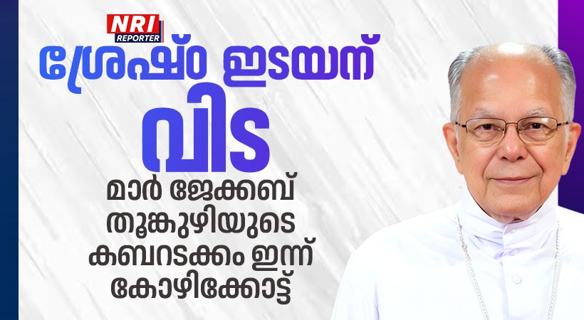 കോഴിക്കോട് : ഈ മാസം 17ന് കാലം ചെയ്ത തൃശൂര് അതിരൂപതയുടെ മുന് മെത്രാപ്പോലീത്ത മാര് ജേക്കബ് തൂങ്കുഴിയുടെ കബറടക്കം ഇന്ന് വൈകിട്ട് കോഴിക്കോട് ജില്ലയിലെ കോട്ടുളിയില്. സംസ്കാര ശുശ്രൂഷകളുടെ ആദ്യഭാഗം ഇന്നലെ തൃശൂര് അതിരൂപത മന്ദിരത്തില് നടന്നു. തുടര്ന്ന് പരിശുദ്ധ വ്യാകുലമാതാവിന് ബസിലിക്കയിലും ലൂര്ദ് കത്തീഡ്രലിലും പൊതുദര്ശനമുണ്ടായിരുന്നു. വന് ജനാവലിയാണ് പ്രിയ ഇടയനെ അവസാനമായി ഒരു നോക്ക് കാണാനും ആദരാഞ്ജലികളര്പ്പിക്കാനും എത്തുന്നത്.