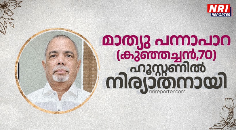 ഹൂസ്റ്റൺ: മാത്യു പന്നാപാറ (കുഞ്ഞച്ചൻ , 70) ഹൂസ്റ്റണിലെ സ്റ്റാഫ്ഫോർഡിൽ നിര്യാതനായി. മേരിക്കുട്ടിയാണ് ഭാര്യ. മക്കൾ: നയിസി, റെയിസി, മരിയറ്റ് എന്നിവരാണ്. അദ്ദേഹം ഹ്യൂസ്റ്റനിലെ മലയാളികളുടെതായ സാമൂഹിക-സാംസ്കാരിക രംഗങ്ങളിൽ വളരെ സജീവമായി പ്രവർത്തിച്ചു വരികയായിരുന്നു. മലയാളി അസോസിയേഷൻ ഓഫ് ഗ്രേറ്റർ ഹ്യൂസ്റ്റൻ, ഹൂസ്റ്റണിലെ Saint ജോസഫ് സി റോമലബാർ കത്തോലിക്ക ദേവാലയ ഇടവക പാരിഷ്കൗൺസിൽ, ICH- ഇന്ത്യകാത്തോലിക്സ് ഓഫ് ഹൂസ്റ്റൺ എന്നീ പ്രസ്ഥാനങ്ങൾ മാത്യു പന്നാപാറയുടെ വേർപാടിൽ അനുശോചനം രേഖപ്പെടുത്തി.