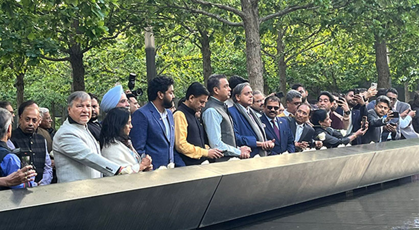 ശനിയാഴ്ച യുഎസിൽ എത്തിയ ശേഷം കോൺഗ്രസ് എംപി ശശി തരൂരിന്റെ നേതൃത്വത്തിലുള്ള സർവകക്ഷി സംഘത്തിലെ അംഗങ്ങൾ 9/11 സ്മാരകത്തിൽ ആദരാഞ്ജലി അർപ്പിച്ചു. കോൺഗ്രസ് എംപി ശശി തരൂരിൻ്റെ നേതൃത്വത്തിൽ എംപിമാരായ ജി എം ഹരീഷ് ബാലയാഗി, ശശാങ്ക് മണി ത്രിപാഠി, ഭുവനേശ്വർ കെ ലത, മിലിന്ദ് ദിയോറഎന്നിവരും മുൻ യുഎസ്അംബാസഡർ തരൺജിത് സിംഗ് സന്ധുവും സ്മാരകത്തിൽ ആദരാഞ്ജലി അർപ്പിച്ചു.