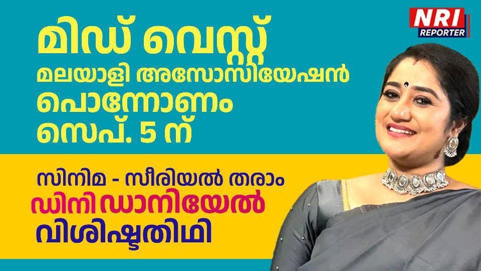 ഷിക്കാഗോ : മിഡ് വെസ്റ്റ് മലയാളി അസോസിയേഷന് ഓഫ് അമേരിക്കയുടെ ഓണാഘോഷ പരിപാടികള് സെപ്റ്റംബര് 5ന് വൈകുന്നേരം മോര്ട്ടന്ഗ്രോവ് സെന്റ് മേരീസ് ഓഡിറ്റോറിയത്തില് (7800 ലിയോണ്സ് സ്ട്രീറ്റ്, മോര്ട്ടണ് ഗ്രോവ്, IL 60053) നടക്കും. പ്രശസ്ത സിനിമ – സീരിയല് താരം ഡിനി ഡാനിയേല് വിശിഷ്ടാതിഥിയാകും.