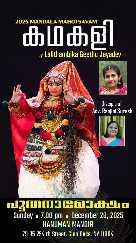 പങ്കെടുക്കുന്നവർ: ന്യൂജെഴ്സിയിൽ നിന്നുള്ള അനിത കൃഷ്ണ, ഡിട്രോയിറ്റിൽ നിന്നുമുള്ള ജ്യോതി & നന്ദിത വെളുത്താക്കൽ, സതീഷ് മമ്പടത്ത് (ഫ്ലൂട്ട്), സാകേത് നാരായണൻ (വയലിൻ), ദീപൻ സ്വാമി (തബല), സതീഷ് കാലാത്ത്, (മൃദംഗം) എന്നിവരാണ്.6.45 മുതൽ 7 വരെ ഹരിവരാസനം നൃത്താവിഷ്കാരം (അർച്ചിത)7 മുതൽ 8 വരെ കഥകളി – പൂതനാമോക്ഷം (ലളിതാംബിക, ഗീതു ജയദേവ്, മിസൗറി)8 മുതൽ 8.30 മഹാ പ്രസാദ വിതരണം, അന്നദാനം. ഈ മണ്ഡല മഹോത്സവത്തിലേക്ക് എല്ലാ ഭക്തജനങ്ങൾക്കും ഹൃദ്യമായി സംഘാടകർ സ്വാഗതം ചെയ്തു. പ്രവേശനം സൗജന്യമായിരിക്കും.