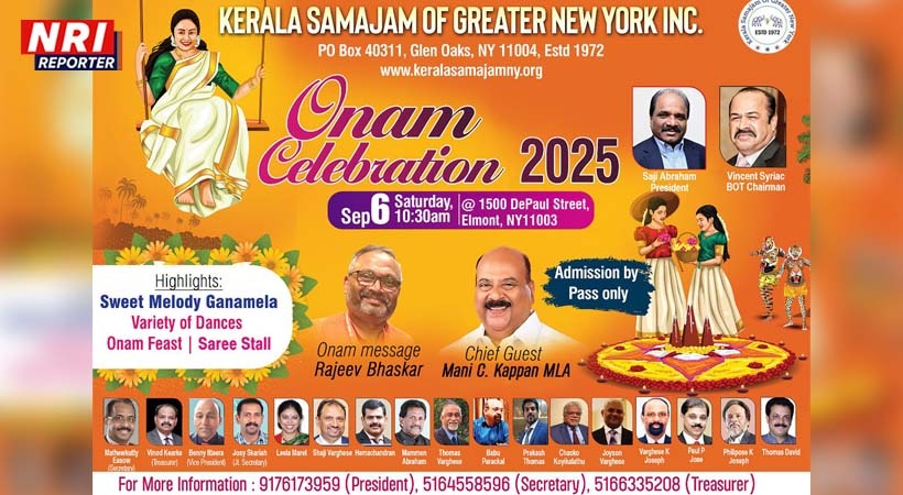 കൂടുതൽ വിവരങ്ങൾക്ക് : (1) Saji Abraham, President – 917-617-3959; (2) Mathewkutty Easow, Secretary – 516-455-8596; (3) Vinod Kearke, Treasurer – 516-633-5208.