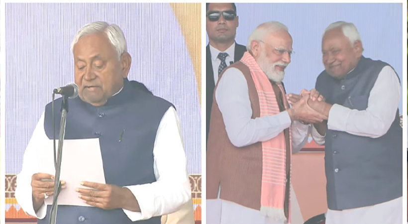 പട്ന: ബിഹാർ മുഖ്യമന്ത്രിയായി നിതീഷ് കുമാർ സത്യപ്രതിജ്ഞ ചെയ്തു. വ്യാഴാഴ്ച രാവിലെ പട്നയിലെ ചരിത്രപ്രസിദ്ധമായ ഗാന്ധി മൈതാനത്ത് നടന്ന ചടങ്ങിൽ ഗവർണർ ആരിഫ് മുഹമ്മദ് ഖാൻ ആണ് സത്യവാചകം ചൊല്ലിക്കൊടുത്തത്. മുഖ്യമന്ത്രി കസേരയിൽ നിതീഷിനിത് പത്താമൂഴമാണ്.