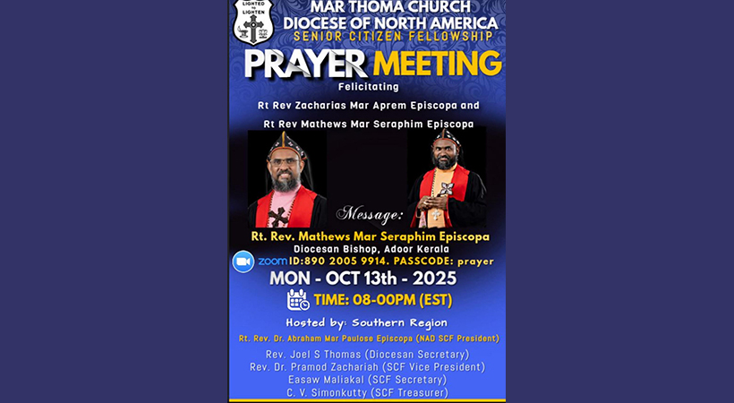 ന്യൂയോര്ക്ക്: മാര്ത്തോമാ നോര്ത്ത് അമേരിക്ക ഭദ്രാസനത്തിന്റെ സീനിയര് സിറ്റിസണ് ഫെലോഷിപ്പിന്റെ ആഭിമുഖ്യത്തില് വിശേഷ പ്രാര്ത്ഥനായോഗവും റൈറ്റ് റവ. സഖറിയാസ് മാര് അപ്രേം എപ്പിസ്കോപ്പാ, റൈറ്റ് റവ. മാത്യൂസ് മാര് സെറാഫിം എപ്പിസ്കോപ്പാ എന്നിവരെ ആദരിക്കലും ഒക്ടോബര് 13 തിങ്കളാഴ്ച അമേരിക്കന് ഈസ്റ്റേണ് ടൈം രാത്രി 8 മണിക്ക് നടത്തപ്പെടുന്നു. (EST) Zoom പ്ലാറ്റ്ഫോമിലൂടെ നടത്തുന്ന ഈ യോഗത്തിനു ആതിഥേയത്വം വഹിക്കുന്നത് സൗത് വെസ്റ് റീജിയണാണ്.