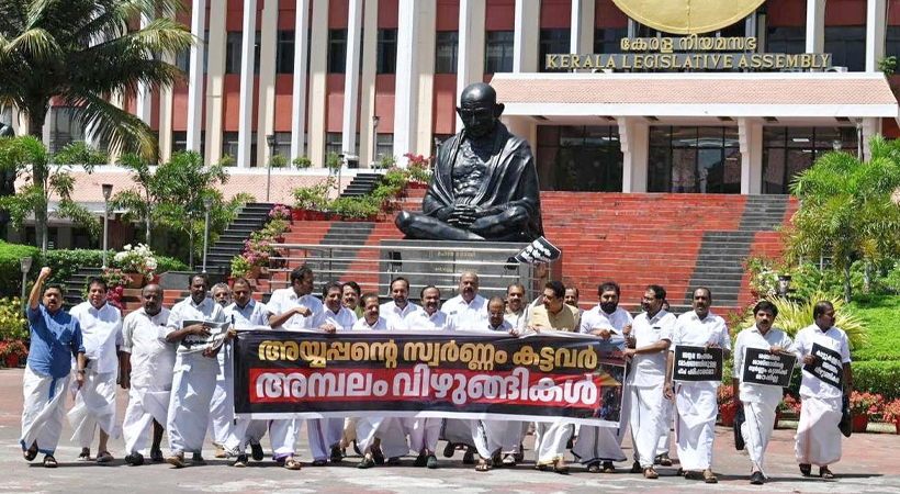 തിരുവനന്തപുരം : ശബരിമലയിലെ സ്വര്ണപ്പാളി തിരിമറി നടന്ന സംഭവത്തില് നിയമസഭയില് തുടര്ച്ചയായ രണ്ടാം ദിവസവും പ്രതിപക്ഷ ബഹളം. മന്ത്രി വി.എന്.വാസവന്റെ രാജി ആവശ്യപ്പെട്ടായിരുന്നു ഇന്നും സഭയില് പ്രതിപക്ഷം കത്തിക്കയറിയത്. ചോദ്യോത്തര വേളയില് ശബരിമലയിലെ സ്വര്ണമോഷണത്തെ ഉയര്ത്തിക്കാട്ടിയ പ്രതിപക്ഷം ബാനറുകളുമായി സഭയുടെ നടുത്തളത്തില് ഇറങ്ങി പ്രതിഷേധിച്ചു.
