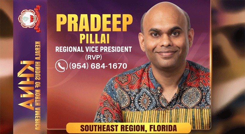 ഫ്ലോറിഡ: നോർത്ത് അമേരിക്കയിലെ മലയാളി ഹിന്ദുക്കളുടെ കേന്ദ്ര സംഘടനയായ കെ.എച്ച്.എൻ.എ (KHNA) യുടെ ഫ്ലോറിഡ റീജിയണൽ വൈസ് പ്രസിഡന്റായി (RVP) സൗത്ത് ഫ്ലോറിഡയിൽ നിന്നുള്ള പ്രദീപ് പിള്ളയെ നാമനിർദേശം ചെയ്തു. സാങ്കേതിക രംഗത്തെ മികവും സാമൂഹിക സേവന രംഗത്തെ പ്രതിബദ്ധതയും കണക്കിലെടുത്താണ് സംഘടനയുടെ ഈ തീരുമാനം.