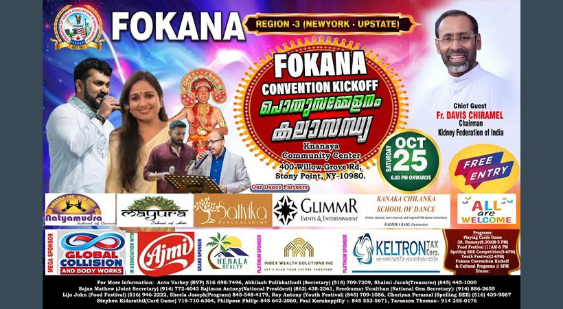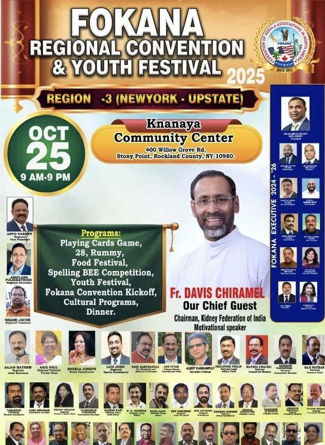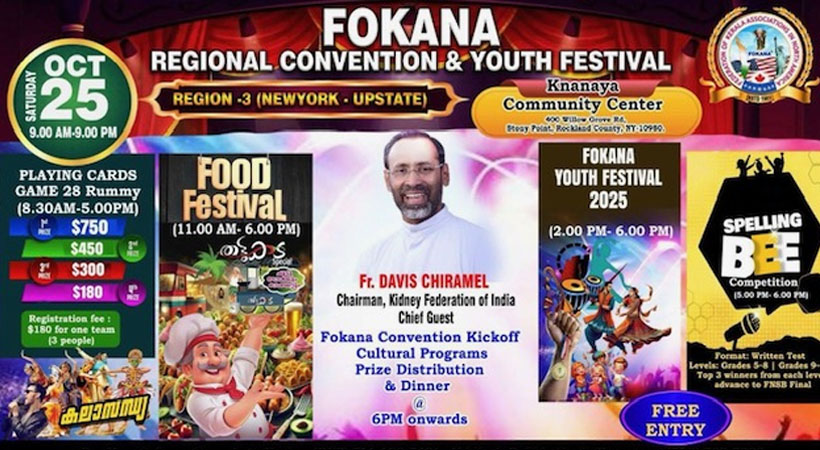 ന്യൂ യോർക്ക് : ഫൊക്കാന ന്യൂ യോർക്ക് അപ്പ്സ്റ്റേറ്റ് റീജിയണൽ കൺവെൻഷനുള്ള ഒരുക്കങ്ങൾ പൂർത്തിയായി. ഫൂഡ് ഫെസ്റ്റിവൽ, യൂത്ത് ഫെസ്റ്റിവൽ, സ്പെല്ലിങ് ബീ കോംപറ്റീഷൻ, ചീട്ടുകളി മത്സരം, ഫൊക്കാന കലഹരി ഇന്റർനാഷണൽ കൺവെൻഷൻ കിക്ക് ഓഫ് തുടങ്ങിയ നിരവധി പരിപാടികളോട് ആണ് റീജണൽ കൺവെൻഷൻ ചിട്ടപ്പെടുത്തിയിട്ടുള്ളത് . ഈ ശനിയാഴ്ച 2025 ഒക്ടോബർ 25, റോക്കലാൻഡ് കൗണ്ടിയിലെ ക്നാനായ കമ്മ്യൂണിറ്റി സെന്ററിൽ വെച്ച് (400 Willow Grove Road, Stony Point , Rockland County) നടത്തുന്ന റീജണൽ കൺവെൻഷനിലേക്കു ഏവരെയും സ്വാഗതം ചെയ്യുന്നു.