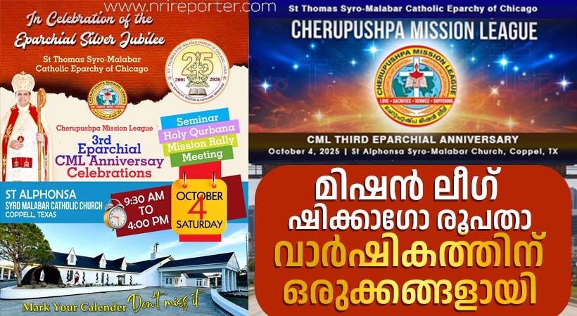 കൊപ്പേൽ: ഒക്ടോബർ 4 ശനിയാഴ്ച്ച സംഘടിപ്പിക്കുന്ന ചെറുപുഷ്പ മിഷൻ ലീഗ് (സി.എം.എൽ.) ചിക്കാഗോ രൂപതയുടെ മൂന്നാം വാർഷികത്തിന് ഒരുക്കങ്ങളായി. ചിക്കാഗോ സെന്റ് തോമസ് സിറോ-മലബാർ രൂപതയുടെ രജത ജൂബിലിയോടാനുബന്ധിച്ചു നടത്തുന്ന ഈ പരിപാടിക്ക് വിപുലമായ ക്രമീകരണങ്ങളാണ് ഒരുക്കിയിരിക്കുന്നത്. അമേരിക്കയിലെ ടെക്സാസ് സംസ്ഥാനത്തുള്ള കൊപ്പേൽ സെന്റ് അൽഫോൻസാ സിറോ-മലബാർ കത്തോലിക്കാ ഇടവക പരിപാടികൾക്ക് ആതിഥേയത്വം വഹിക്കും.