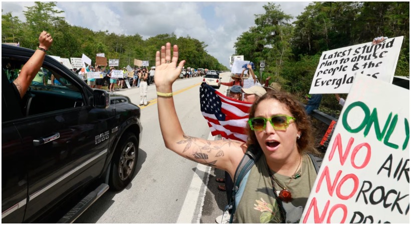 ഫ്ലോറിഡ: എവർഗ്ലേഡ്സിൽ നിർമ്മിക്കാൻ പോകുന്ന കുടിയേറ്റ തടങ്കൽപ്പാളയത്തിനെതിരെ പരിസ്ഥിതി പ്രവർത്തകരും തദ്ദേശീയ ഗോത്രവിഭാഗക്കാരും ഉൾപ്പെടെയുള്ള നിരവധി സംഘടനകൾ പ്രതിഷേധവുമായി രംഗത്ത്. ശനിയാഴ്ച എവർഗ്ലേഡ്സിലെ ഒരു എയർസ്ട്രിപ്പിന് പുറത്ത് നൂറുകണക്കിന് ആളുകളാണ് പ്രതിഷേധത്തിനായി ഒത്തുകൂടിയത്.