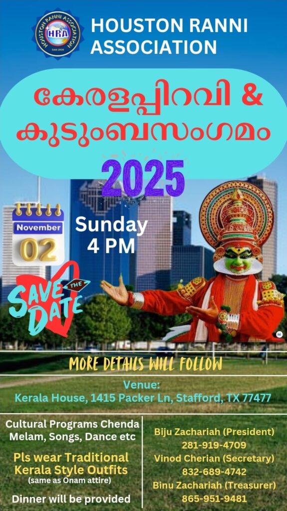 ഹൂസ്റ്റൺ: ഒന്നര പതിറ്റാണ്ടിലേറെയായി ഹൂസ്റ്റണിൽ ശക്തമായി പ്രവർത്തിക്കുന്ന ഹൂസ്റ്റൺ റാന്നി അസോസിയേഷൻ്റെ (HRA) കേരളപ്പിറവി ആഘോഷവും കുടുംബ സംഗമവും നവംബർ രണ്ടാം തീയതി ഞായറാഴ്ച്ച വൈകുന്നേരം നാല് മണി മുതൽ കേരള ഹൗസിൽ[ മാഗ് ] ഹാളിൽ കേരളത്തനിമയോതുന്ന വിവിധ കലാപരിപാടികളൊടെ നടത്തുവാൻ തീരുമാനിച്ചു. HRA പ്രസിഡൻ്റ് ബിജു സഖറിയാ അധ്യക്ഷത വഹിച്ച എക്സിക്യൂട്ടീവ് കമ്മിറ്റിയിൽ ജനറൽ സെകട്ടറി വിനോദ് ചെറിയാൻ സ്വാഗതം പറഞ്ഞു. ഉപ രക്ഷാധികാരി ജിമോൻ റാന്നി, വൈസ് പ്രസിഡൻ്റുമാരായ ജിൻസ് മാത്യു കിഴക്കേതിൽ,മാത്യുസ് ചാണ്ടപ്പിള്ള ജോയിൻറ്റ് ട്രഷറർ സ്റ്റീഫൻ ഏബ്രഹാം,സജി ഇലഞ്ഞിക്കൽ എന്നിവർ പ്രസംഗിച്ചു.ട്രഷറർ ബിനു സഖറിയാ നന്ദി രേഖപ്പെടുത്തി.