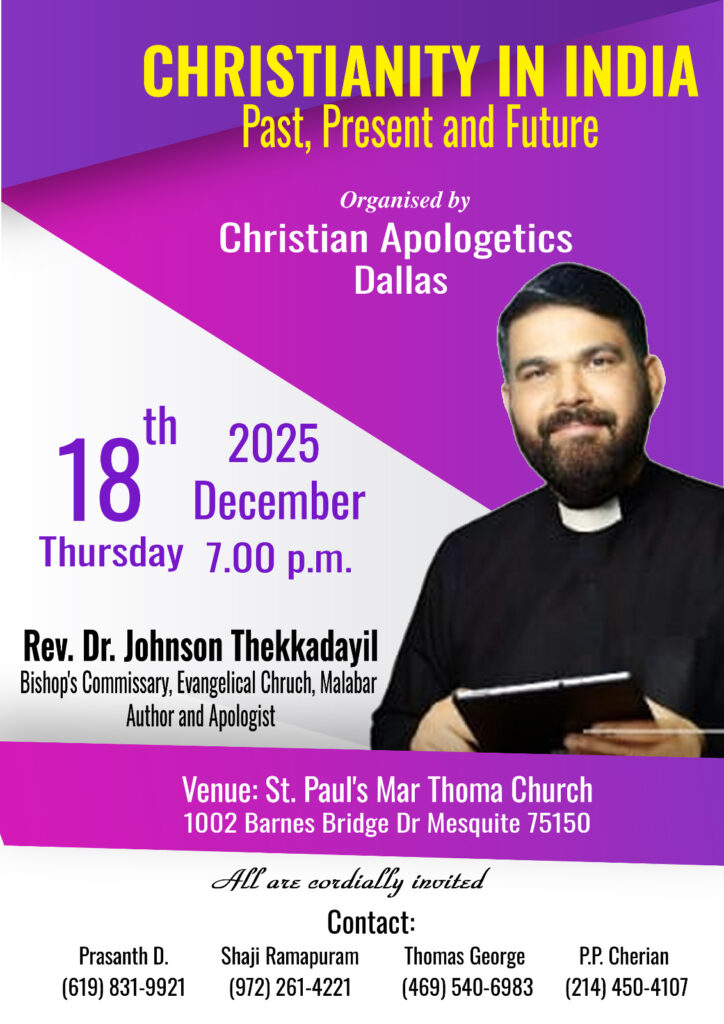 ഡാലസ്: ക്രിസ്ത്യൻ അപ്പോളജറ്റിക്സ് ഡാലസിന്റെ നേതൃത്വത്തിൽ ഇന്ത്യയിലെ ക്രൈസ്തവ സമൂഹത്തിന്റെ ഭൂതകാലം, വർത്തമാനകാലം, ഭാവികാലം എന്ന വിഷയത്തെ അധികരിച്ച് സെമിനാർ ഡിസംബർ 18 വ്യാഴാഴ്ച്ച വൈകിട്ട് 7 മണിക്ക് ഡാലസ് സെന്റ്.പോൾസ് മാർത്തോമ്മ ദേവാലയത്തിൽ (1002 Barnes Bridge Rd, Mesquite, Tx 75150) നടത്തപ്പെടുന്നു.