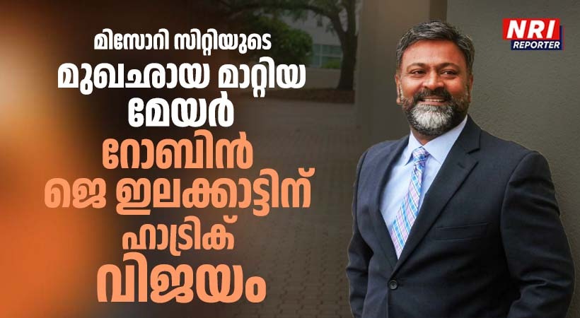 മിസോറി സിറ്റി: അമേരിക്കൻ മലയാളികൾക്ക് ഇത് അഭിമാന നിമിഷം. മിസോറി സിറ്റി മേയറായി മൂന്നാം തവണയും മലയാളിയായ റോബിൻ ഇലക്കാട്ട് തെരഞ്ഞെടുക്കപ്പെട്ടു. ഹാട്രിക് വിജയമാണ് അദ്ദേഹം നേടിയത്. രണ്ട് ടേമിലായി മിസ്സൂറി സിറ്റിയുടെ മുഖഛായ മാറ്റിയ റോബിൻ ഇലക്കാട്ടിനു മിന്നും വിജയമാണ് ഇക്കുറി നേടാനായത്. 55% വോട്ടാണ് റോബിൻ ഇലക്കാട്ടിന് ലഭിച്ചത്. എതിർ സ്ഥാനാർത്ഥി ജെഫറി ബോണിക്ക് 45 ശതമാനം വോട്ടും.