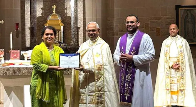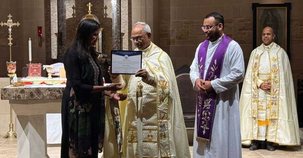 ഫ്രിസ്കോ: നോർത്ത് ഡാലസിലെ വിശുദ്ധ മറിയം ത്രേസ്യാ സിറോ മലബാർ മിഷനിൽ തിയോളജി ഡിപ്ലോമ ബിരുദധാരികളെ ആദരിച്ചു. മിഷനിൽ നിന്നുള്ള കിരൺ ജോർജ്, ഷീന അന്ന ജോൺ എന്നിവരെയാണ് ആദരിച്ചത്. ഇരുവരും ദൈവശാസ്ത്ര പഠനത്തിൽ രണ്ടു വർഷത്തെ ഡിപ്ലോമ ബിരുദമാണ് കരസ്ഥമാക്കിയിരിക്കുന്നത്. ഇരുവരും മിഷനിലെ സജീവ ശുശ്രൂഷകരും മതബോധന അധ്യാപകരുമാണ്.