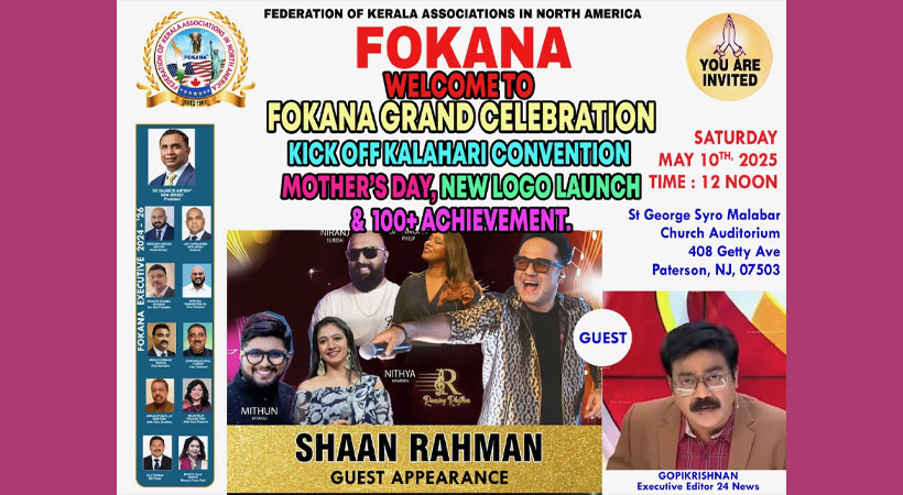 ന്യൂ യോർക്ക് : ഫൊക്കാന കലഹാരി കൺവെൻഷൻ കിക്കോഫ്, ഫൊക്കാനാ ലോഗോ ലോഞ്ചിങ് , മതേർസ് ഡേ ആഘോഷം എന്നിവ സംയുക്തമായി 2025 മെയ് 10 ശനിയാഴ്ച ഉച്ചക്ക് 12 മണി മുതൽ സെന്റ്. ജോർജ് സിറോ മലബാർ ചർച്ച് ഓഡിറ്റോറിയത്തിൽ ( 408 Getty Avenue, Paterson, NJ 07503) വെച്ച് അതി വിപുലമായ പരിപാടികളോട് നടത്തുബോൾ അതിൽ ഷാൻ റഹ്മാൻ സംഘവും, ചാനൽ 24ന്റെ എക്സിക്യൂട്ടീവ് എഡിറ്റർ ഗോപികൃഷ്ണയും ഗസ്റ്റ് ആയി പങ്കടുക്കുമെന്ന് പ്രസിഡന്റ് സജിമോൻ ആന്റണി അറിയിച്ചു.