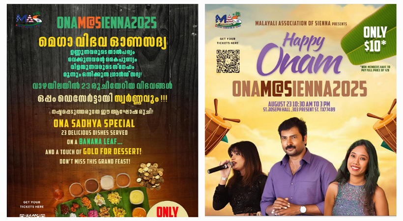 സിയന്നയിലെ മലയാളി സമൂഹം ഒരുമിച്ച് ആഘോഷിക്കുന്ന ആദ്യത്തെ വൻഓണാഘോഷം “ONAM@SIENNA2025” ആഗസ്റ്റ് 23 ന് രാവിലെ 10.30 മുതൽ ഉച്ചയ്ക്ക് 3 വരെ St. Joseph Hall, 303 Present St, TX 77489-ൽ നടക്കും. ഓണസദ്യയുടെ രുചിയും, മലയാളത്തിന്റെ കലാപാരമ്പര്യവും, സംഗീതത്തിന്റെ മാധുര്യവും ഒരുമിപ്പിക്കുന്ന ഈ ആഘോഷത്തിന് മലയാളികളുടെ പ്രിയതാരമായ നരൻ ആദ്യമായ് ഹൂസ്റ്റണിലെത്തുന്നു. സംഗീത ലോകത്തെ മിന്നുന്ന താരങ്ങളായ ലക്ഷ്മി മെസ്മിനും റീവയും ഒരുക്കുന്ന സംഗീത വിരുന്ന് ആഘോഷത്തിന്റെ മുഖ്യ ആകർഷണമാകും … കൂടെ സ്വർണ്ണ മഴയും പരിപാടി ആകർശകമാക്കും.
