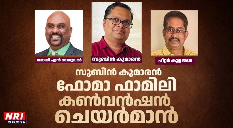 ഹൂസ്റ്റണ്: അമേരിക്കന് മലയാളികളുടെ ഏറ്റവും വലിയ കേന്ദ്ര സംഘടനനായ ഫോമായുടെ 2026-ലെ ഒമ്പതാമത് ഇന്റര്നാഷണല് ഫാമിലി കണ്വന്ഷന്റെ ചെയര്മാനായി സാമൂഹിക സാംസ്കാരിക പ്രവര്ത്തകനും വ്യവസായിയുമായ സുബിന് കുമാരനെയും ജനറല് കണ്വീനറായി സംഘാടകനായ ജോയി എന് സാമുവലിനെയും ഫോമാ മിഡ് ടേം ജനറല് ബോഡി തിരഞ്ഞെടുത്തതായി പ്രസിഡന്റ് ബേബി മണക്കുന്നേല് അറിയിച്ചു. വ്യക്തിപരമായ കാരണങ്ങളാല്, നിലവിലെ ചെയര്മാന് മാത്യൂസ് മുണ്ടയ്ക്കല് സ്ഥാനമൊഴിഞ്ഞതിനെ തുടര്ന്നാണ് ജനറല് കണ്വീനറായ സുബിന് കുമാരനെ തല്സ്ഥാനത്തേയ്ക്ക് നിയോഗിച്ചതെന്ന് ബേബി മണക്കുന്നേല് പറഞ്ഞു.