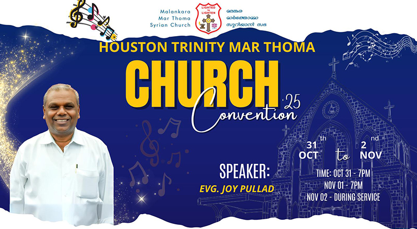 ഹൂസ്റ്റണ് : ഹൂസ്റ്റണ് ട്രിനിറ്റി മാര്ത്തോമാ ഇടവകയുടെ ആഭിമുഖ്യത്തില് ഈ വര്ഷത്തെ കണ്വെന്ഷന് ഒക്ടോബര് 31, നവംബര് 1, 2 (വെള്ളി, ശനി,ഞായര്) തീയതികളില് നടത്തപ്പെടും. ഞായറാഴ്ച രാവിലെയുള്ള ആരാധന മദ്ധ്യേ കണ്വെന്ഷന്റെ സമാപന പ്രസംഗം നടത്തും.