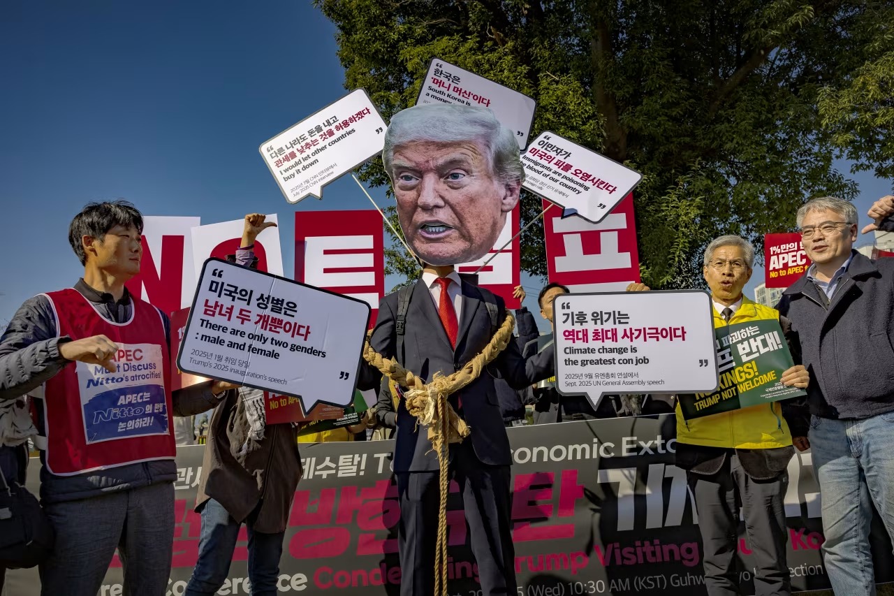 ഗ്യോങ്ജു, ദക്ഷിണ കൊറിയ: യുഎസ് പ്രസിഡന്റ് ഡോണൾഡ് ട്രംപിനെതിരെ ദക്ഷിണ കൊറിയയിലും പ്രതിഷേധം. യുഎസ് പ്രസിഡന്റ് ദക്ഷിണ കൊറിയയിലെ ഗ്യോങ്ജുവിൽ എത്തിയപ്പോൾ, അദ്ദേഹത്തെ എതിരേറ്റത് ചെറിയതെങ്കിലും ശക്തമായ പ്രതിഷേധങ്ങളായിരുന്നു. ട്രംപിന്റെ ഏകാധിപത്യ നിലപാടുകൾക്കെതിരെ യുഎസിൽ നടന്ന നോ കിംഗ്സ് റാലികളെ സൂചിപ്പിക്കുന്ന ബാനറുകളും പ്ലക്കാർഡുകളുമാണ് ട്രംപ് വിരുദ്ധ പ്രവർത്തകർ ഉയർത്തിയത്.