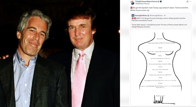 ജെഫ്രി എപ്സ്റ്റീനുവേണ്ടി സമാഹരിച്ച 2003 ലെ ജന്മദിന പുസ്തകത്തില് പ്രസിഡന്റ് ട്രംപിന്റെ ഒപ്പുതന്നെയാണുള്ളതെന്ന് വാദിച്ച് ആ ഒപ്പും ഒരു കൈയെഴുത്തു കുറിപ്പും ഒരു സ്ത്രീയുടെ നഗ്ന ചിത്രവും ഡെമോക്രാറ്റുകള് പുറത്തുവിട്ട കത്തിന്റെ ഭാഗങ്ങളിലുണ്ട്. ”ഞങ്ങള്ക്ക് ജെഫ്രി എപ്സ്റ്റീനുള്ള ട്രംപിന്റെ ജന്മദിന കുറിപ്പ് ലഭിച്ചു, ഇത് ”അദ്ഭുതകരമായ രഹസ്യ”ത്തെക്കുറിച്ച് സംസാരിക്കുന്നു. അദ്ദേഹം എന്താണ് മറയ്ക്കുന്നത്? ഫയലുകള് പുറത്തുവിടുക,” ഓവര്സൈറ്റ് ഡെമോക്രാറ്റുകള് എക്സില് എഴുതി.