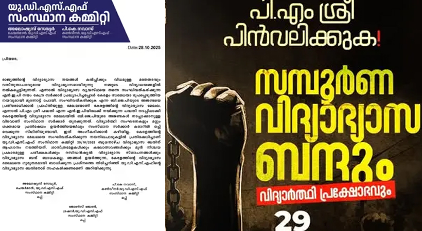 ”സംഘിവത്കരിക്കുക എന്ന ബിജെപിയുടെ അജണ്ടയെ പ്രതിരോധിക്കാന് പ്രാപ്തിയുള്ള മേഖലയാണ് കേരളത്തിന്റെ വിദ്യാഭ്യാസ രംഗം. എന്നാല് പിഎം ശ്രീ പദ്ധതി എന്ന എന്ഇപിയിലേക്ക് നയിക്കുന്ന പദ്ധതി നടപ്പിലാക്കി കേരളത്തിന്റെ വിദ്യാഭ്യാസ മേഖലയില് ബിജെപിയുടെ അജണ്ടകള് നടപ്പാക്കാനുള്ള വിടവാണ് സംസ്ഥാന സര്ക്കാര് തുറക്കുന്നത്”- യുഡിഎസ്എഫ് നേതൃത്വം ആരോപിച്ചു. ഇത് അംഗീകരിക്കാന് കഴിയില്ലെന്നും നേതാക്കള് പ്രസ്താവനയിലൂടെ പറഞ്ഞു.