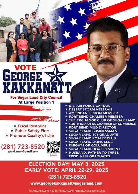 ഹ്യൂസ്റ്റൺ: മേയ് 3 ടെക്സാസിലെ സമ്പന്ന നഗരങ്ങളിലൊന്നായ ഷുഗർലാൻഡ് സിറ്റി കൗൺസിലിലേക്കുള്ള തെരെഞ്ഞെടുപ്പ് നടക്കുന്ന ദിനം. ‘നമ്മളിൽ ഒരാൾ ഈ നാടിന്റെ പ്രതിനിധിയാകാൻ അങ്കത്തട്ടിൽ പോരാട്ടത്തിന് ഇറങ്ങുകയാണ്.