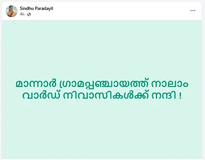 ആലപ്പുഴ: തദ്ദേശ തിരഞ്ഞെടുപ്പിൽ മാന്നാർ ഗ്രാമപഞ്ചായത്തിലെ നാലാം വാർഡിലെ സിപിഎം സ്ഥാനാർഥി സജികുമാർ പരടയിലിനെ തോൽപ്പിച്ചതിൽ നന്ദി പറഞ്ഞ് ഭാര്യ സിന്ധു പരടയിൽ. ഫെയ്സ്ബുക്ക് പോസ്റ്റിലൂടെയാണ് മാന്നാർ ഗ്രാമപ്പഞ്ചായത്ത് നാലാം വാർഡ് നിവാസികൾക്ക് നന്ദി !’ എന്നിങ്ങനെ വോട്ടർമാർക്ക് നന്ദി പറഞ്ഞത്. സിപിഎം സ്ഥാനാർത്ഥിയായ സജികുമാറിനെ ബിജെപി സ്ഥാനാർഥി കലാധരനാണ് തോൽപ്പിച്ചത്.