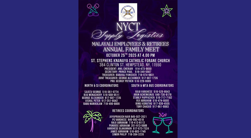 ന്യൂയോർക്ക്: ന്യൂയോർക്ക് സിറ്റി ട്രാൻസിറ്റിലെ സപ്ലൈ ലൊജിസ്റ്റിക്സിലുള്ള മലയാളികളായ ഉദ്യോഗസ്ഥരുടെയും, സർവീസിൽ നിന്ന് പിരിഞ്ഞു പോയവരുടെയും “കുടുംബ സംഗമം“ 2025 ഒക്ടോബർ 25 ശനിയാഴ്ച്ച വൈകിട്ട് 4 മണി മുതൽ ഹെംസ്റ്റെഡിലെ സെന്റ് സ്റ്റീഫൻസ് ക്നാനായ കാത്തലിക് ഫൊറേൻ ചർച്ച് (384 Clinton Street, Hempstead, NY 11550) ഓഡിറ്റോറിയത്തിൽ വച്ച് നടക്കുന്നതാണ്. കഴിഞ്ഞ സംഗമത്തിനു ശേഷം സർവീസിൽ നിന്നും വിരമിച്ചവരെ ഈ സംഗമത്തിൽ വച്ച് ആദരിക്കുവാനും പ്രശംസാ ഫലകം നൽകാനുമാണ് ഉദ്ദേശിക്കുന്നത്. അതിനുവേണ്ടി സർവീസിൽ നിന്ന് വിരമിച്ചവരുടെ വിശദവിവരം അറിയിക്കണമെന്ന് പ്രസിഡന്റ് അനിൽ ചെറിയാൻ അഭ്യർത്ഥിക്കുന്നു. കൂടുതൽ വിവരങ്ങൾക്ക് ഇതോടൊപ്പം കൊടുത്തിരിക്കുന്ന ഫ്ലയർ കാണുക.